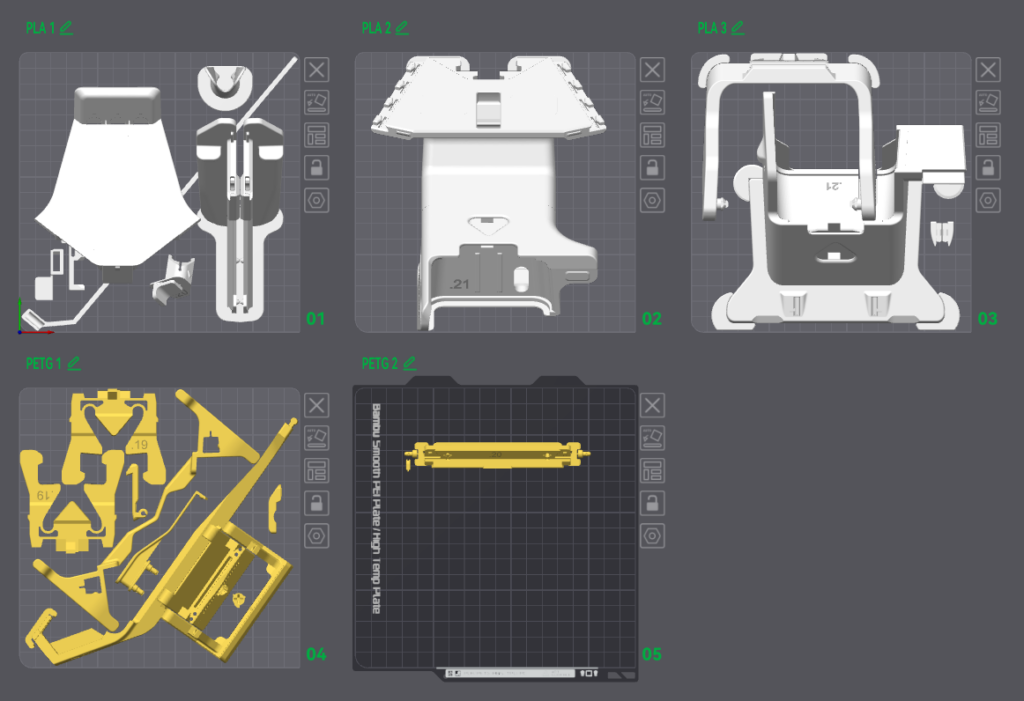 The file can be opened in Bambu Studio or Orca Slicer. While slicing, ignore the “floating regions” warnings, as the parts are using prebuilt support. You will need appr. 450g of PLA and 100g of PETG. It is recommended to use regular PLA and PETG (of any brand) with 0.4mm nozzle. We also recommend to avoid using Silk, Mate, CF or GF filaments as this can cause tolerance issues. For same reason print all parts using PETG is also not recommended. You can change the printing settings to speed up the print or make it more robust, but be aware of possible tolerance issues here, too.
