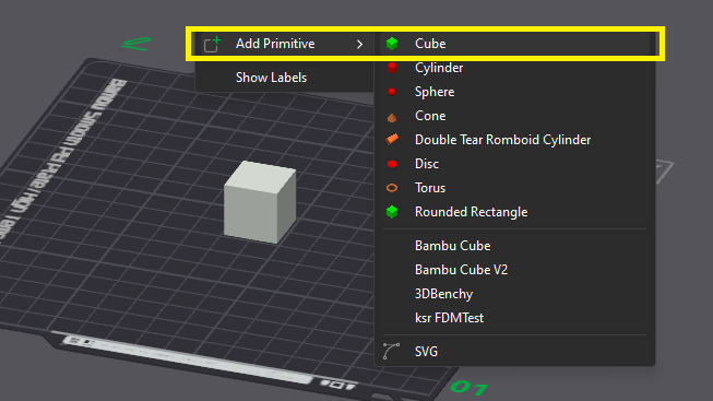 To do this please detach the plate hook if already attached. Place the plate on your heat-bed and prepare . Then open your slicer, add a cube (right click > Add primitive > Cube).